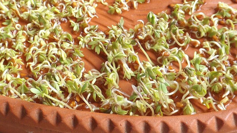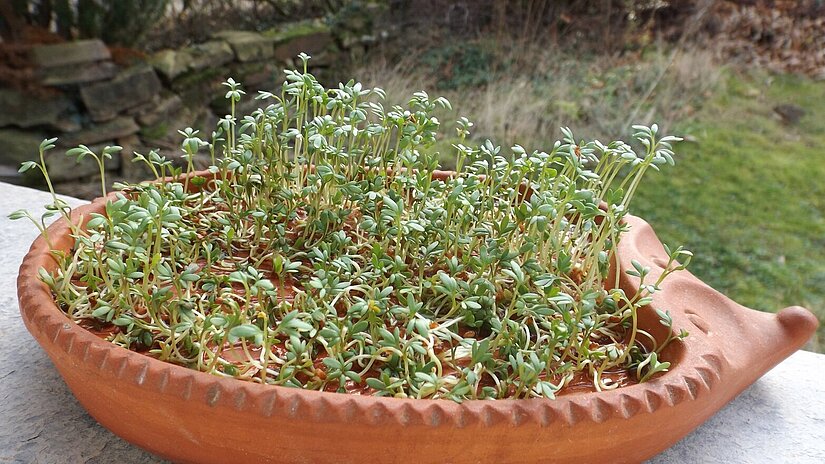 Ganzjährig frisches, vitaminreiches Grün. Nach ein bis zwei Wochen als Keimlinge erntereif. Über den Winter im Blumentopf.